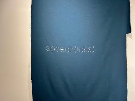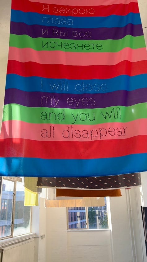 These flags made up an installation, hanging down from the ceiling, with phrases and statements stitched into the fabric, gently whispered as you brush past them. They ask you to question the consequences of silence and denial, and of silencing dissent, of not speaking about difficult realities.
