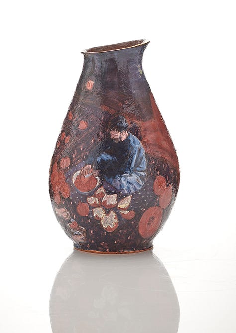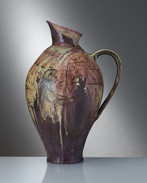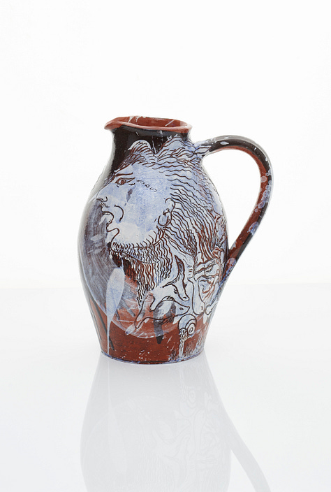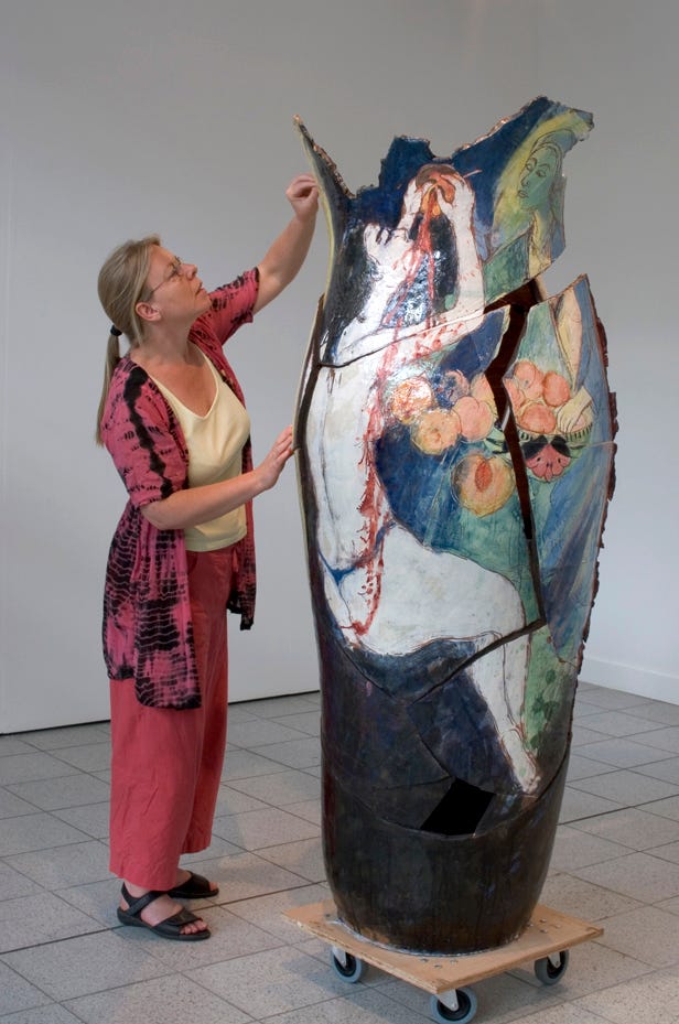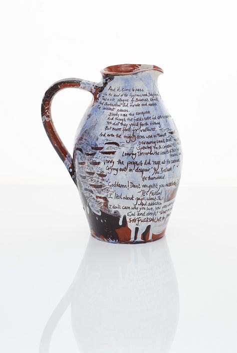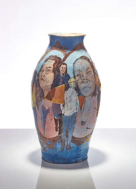 She makes fabulous pots, some huge, and because she is extremely skilled and inventive in her use of her chosen material, clay — one can spend a long time looking at a piece without ever quite exhausting its possibilities. Her work tends to be characterised by narratives which she creates and draws and paints on to the clay, using a range of glazing techniques. Not all her pots are politically charged, but in this podcast we focus mainly on those that are, some of which have triggered her cancellation from exhibitions.