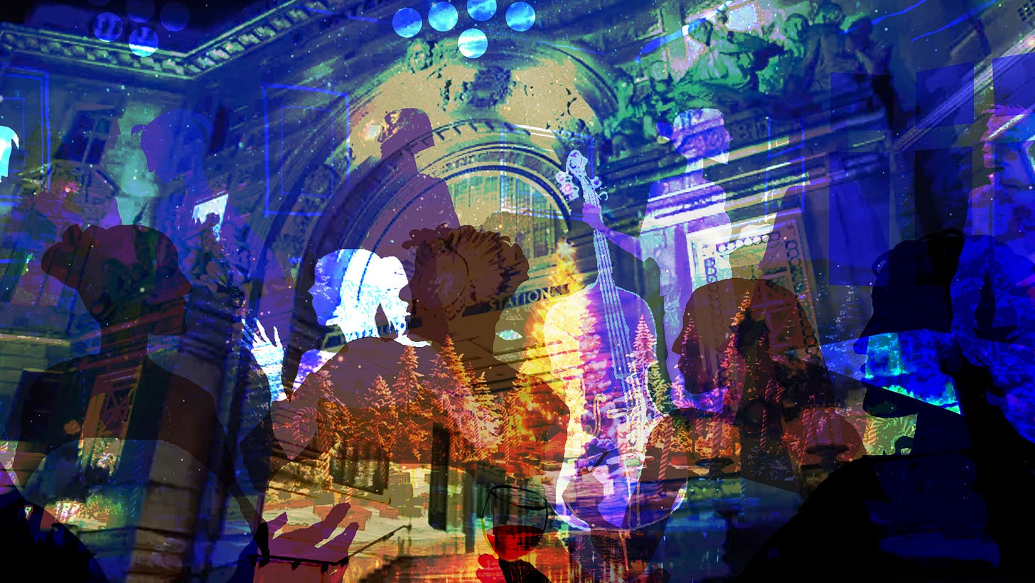 The music for this section was recorded at Waterloo Station where Mick just happened to stumble upon the London Philharmonic Orchestra entertaining commuters. And he also recorded a wonderful choir performing at Vauxhall station but we didn’t get their name. And we eavesdrop on our friends singing along at our annual Christmas carols party.